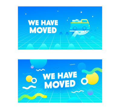 We Have Moved Banners with Truck on Blue Background with Synthwave Grid and Abstract Geometric Pattern. Office Change Address
