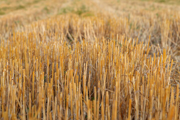 Close up of yellow field after harvesting. Harvested wheat field with remaining plant stubble. Selective focus