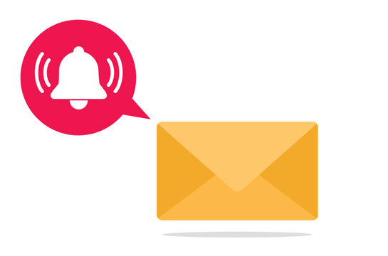 Orange email envelope. Next to the envelope there is a white speech bubble with a red bell icon. Flat design illustration.