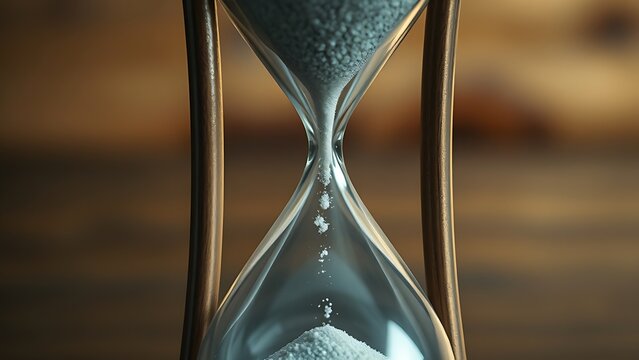 infamy. Final grain of sand falling through hourglass center, soft wooden background, dramatic lighting. wellbeing guides.