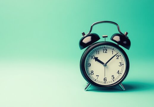 Vintage black alarm clock against a pastel green background symbolizes time and nostalgia.