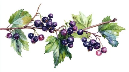 Black currant branch with leaves Watercolor illustration Isolated on a white background Food ingredient culinary use natural remedy Suitable for tea packaging design and wrapping paper