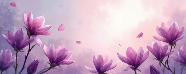 Floral watercolor painting shows magnolias. Petals fall from pink purple blooms. Art suggests peace memorial celebration design. Backdrop represents loss sympathy remembrance grief calmness, used for