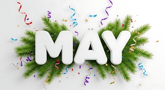 May holidays and celebrations with festive confetti and greenery on a white background