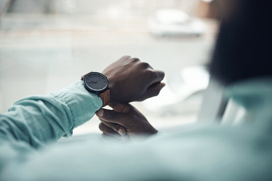 Business, person and watch to check time, schedule or appointment for meeting, deadline or reminder to be punctual. Professional agenda, plan and urgency with wristwatch, accessory or jewelry