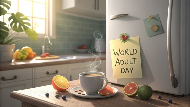 Creative kitchen countertop setup with morning light, coffee cup and note featuring World Adult Day reminder concept.
