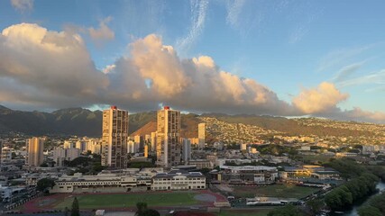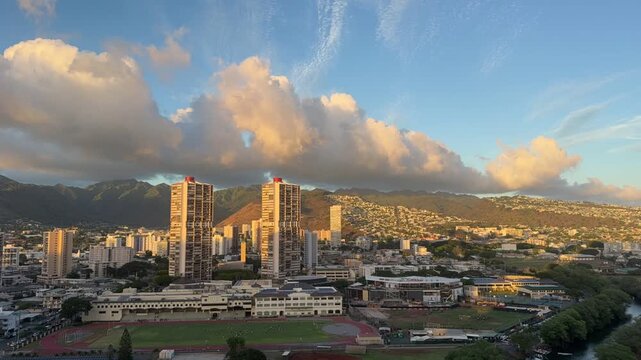 Time-lapse photography of Cumulus clouds. Koʻolau Range is the dormant fragmented remnant of the eastern or windward shield volcano. ‘Iolani School. Waikiki, Honolulu, Oahu, Hawaii.