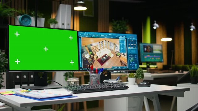 Isolated mockup and CAD software used by black female graphic designer to create a modern layout, 3D modeling program and chroma key on dual monitors. Architectural design assets. Camera A.