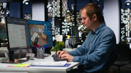 Skilled architect creating a 3D render of apartment interior layout, utilizing architectural software on dual monitors. Developer uses digital tools to decorate design, placing assets. Camera B.