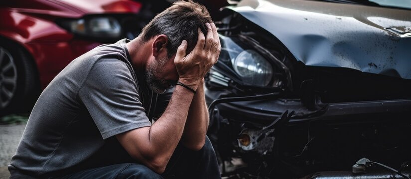 A remorseful man sits in front of a wrecked car, holding his head in pain after a car crash