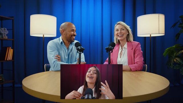 Two hosts engage in a lively podcast discussion with a remote guest appearing on a screen. The hosts listen, interact, and react with interest and amusement