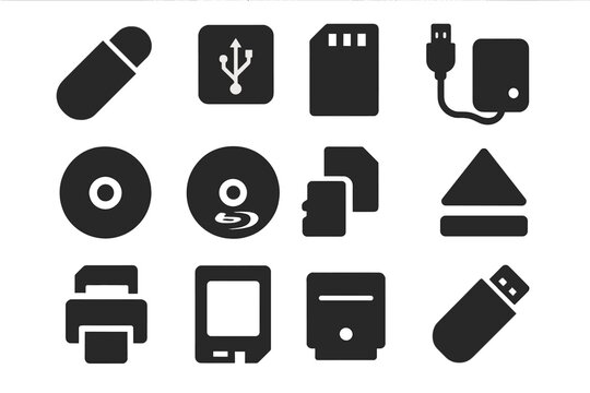 Removable Storage Icons. Solid style icons of removable storage: flash drive icon, USB port icon, SD card, external hard disk, DVD