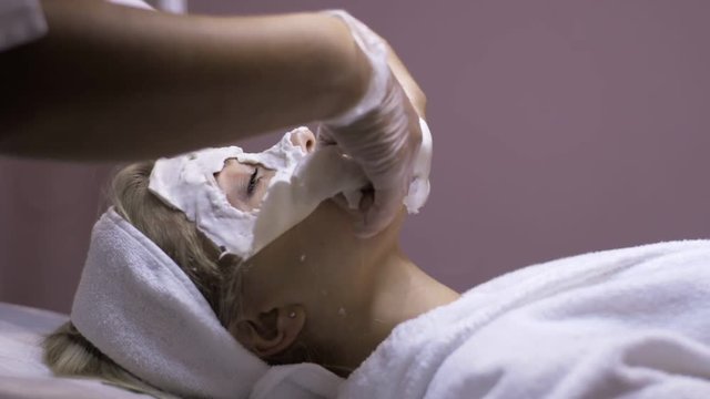 Cosmetician removing mask from client face at beauty salon
