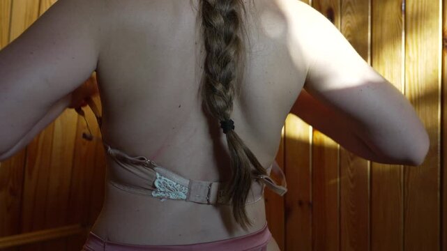 Woman removing bra from her back in a private wooden room.
