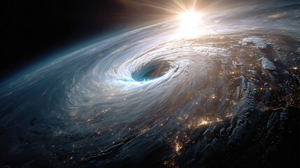 A swirling vortex of clouds dominates this artistic rendition of a planet from space, illuminated by a radiant sun overhead, creating a dramatic cosmic spectacle.