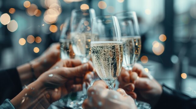 This festive image captures a group of individuals clinking champagne glasses, symbolizing celebration, joy, and unity, making it perfect for themes of parties or gatherings.