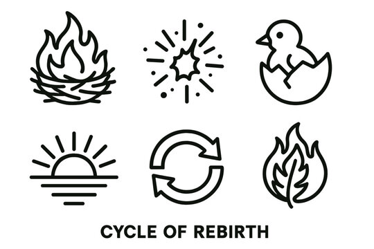 Rebirth Icons. Cycle of Rebirth linear icon set. burning nest, ember spark, new hatchling, sunrise, renewal symbol, feather in flame