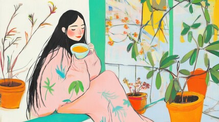 Cheerful girl embracing spring vibes in cozy pastel setting for relaxation and inspiration