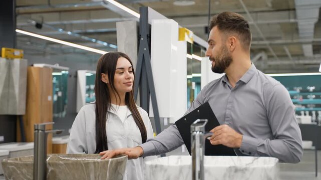 Married couple receives help from seller in plumbing store during shop visit, selecting sink for bathroom hardware needs in home, focusing on service in a professional setting with care.