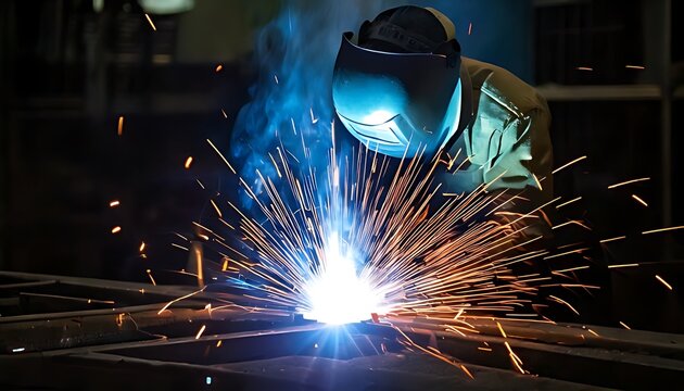 Welder in protective gear sparks brilliant light while joining metal pieces with an intense, glowing arc