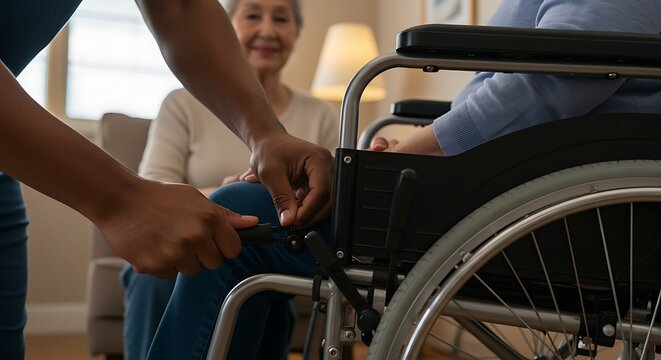 Elderly woman seated in wheelchair focusing on mobility assistance, accessibility awareness day