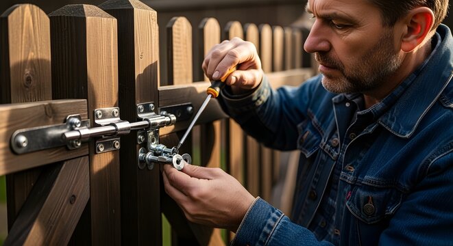 Man in denim jacket repairs a metal latch on a wooden fence with a screwdriver in outdoor setting