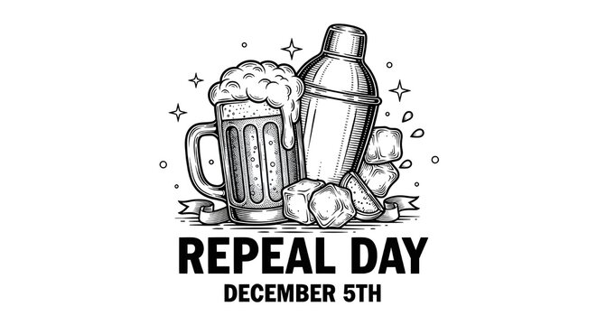 Repeal Day December 5th Black and White Vintage Engraving Style Illustration of a Beer Mug, Cocktail Shaker, and Ice Cubes.