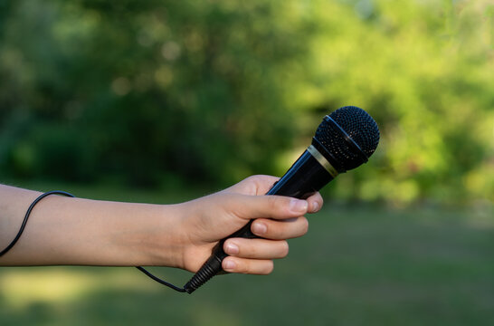 Microphone in hand against the background of a green park.Take an interior view.Profession is a reporter.Recording the sound of nature.