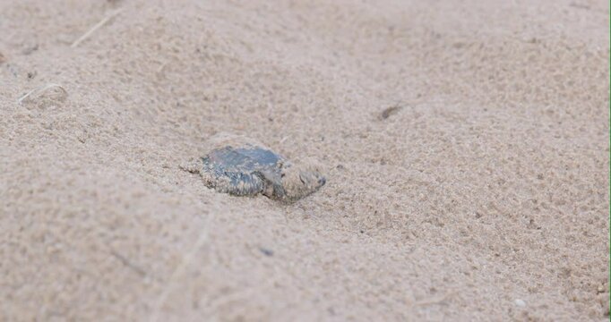 a  tracking shot of a baby loggerhead turtle walking down a sand dune at mon repos beach in bundaberg, australia