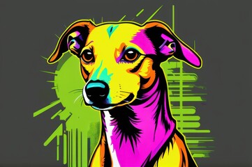 Bright drawing of a dog, whippet, on a T-shirt on a dark background. Satirical, pop art style, vibrant colors, iconic characters, action-packed, suitable for mascot or logo or reproduce on canvas