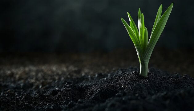 Leek replant on soil growing from cutting tree trunk on dark background