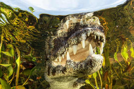 Spectacled caiman (Caiman crocodilus) underwater portrait, Pantanal, Mato Grosso, Brazil.