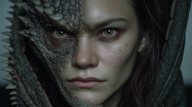 Intense portrait of a woman with reptilian transformation.