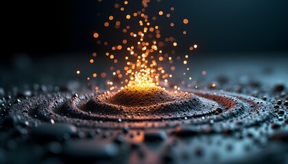 3D animation of an abstract background on which three spherical drops on a magnetic cushion slide along the surface of liquid bronze with highlights and artifacts and noise. The idea of an experiment