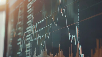Glowing upward arrow graph on digital screen with financial charts, symbolizing stock market growth, corporate success and positive economic trends.