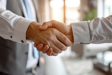 Successful businessmen confidently shake hands in a reputable real estate agency, marking triumphant culmination of a lucrative business deal involving purchase or rental of a splendid house, solidify