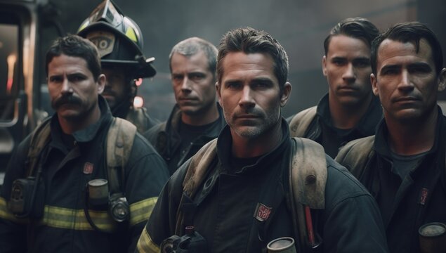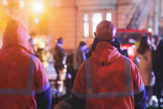 Group of fire men in protective uniform during fire fighting operation in the night city streets, firefighters brigade with the fire engine truck vehicle, emergency and rescue service