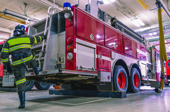Fireman in uniform in front of fire truck going to rescue and protect. Emergancy servise concept.