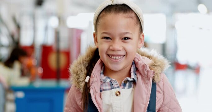 Face, smile and a student girl at a science fair for learning, growth or child development. Portrait, education and future with a happy young female kid at a school closeup for research or experiment