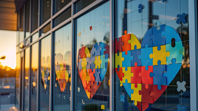 The glass wall of the healthcare institution for the development of children with autism syndrome, decorated with hearts made of pieces of colorful puzzles