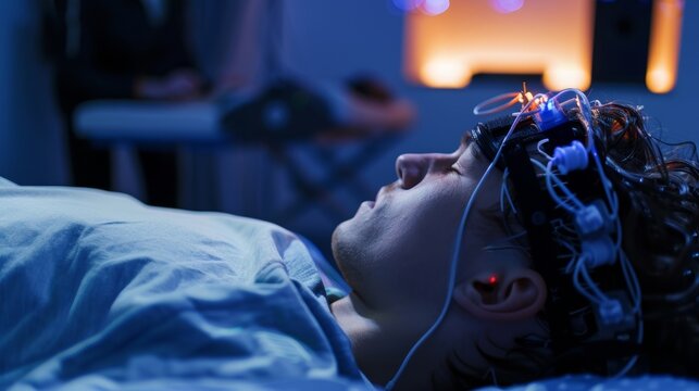 An EEG headset being worn by a participant in a sleep study with researchers monitoring brain activity in the background