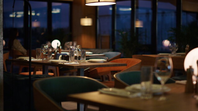 Set of reserved tables for two. Beautiful romantic dinner. Romantic setting. Table with tablecloth, cutlery, glasses, wine, bouquet of flowers, rose, candles, napkins. Vector cartoon illustration