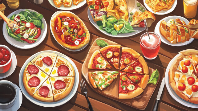 Dining tables in restaurant vector set lunch dinner date in cafe with glasses of wine Italian pizza Chinese food Oriental cuisine illustration isolated on white background
