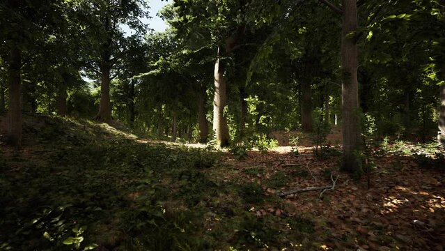 Last light of day entering old forest just rain after