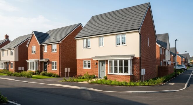 A residential area at dusk with spacious homes and yards captured from the street providing room for copy