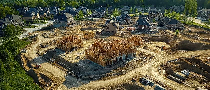 Aerial view of a residential construction site featuring multiple houses and surrounding greenery under development.