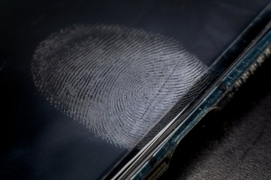 Close-up of realistic dirty glossy smart phone electronics device screen with fingerprint residue above in-screen reader