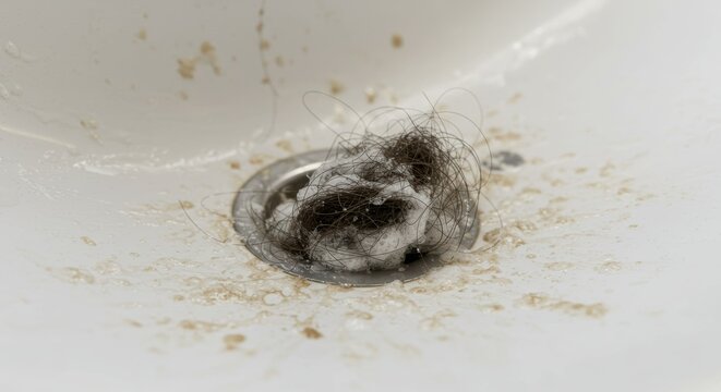 Clogged bathroom sink drain with hair and soap residue in white porcelain basin closeup