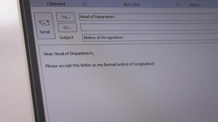 Great resignation talent workforce leave toxic workplace find change new job. Close-up laptop screen write resign e-mail to HR fail loss in career crisis issue. Quiet quitting mail work end letter.