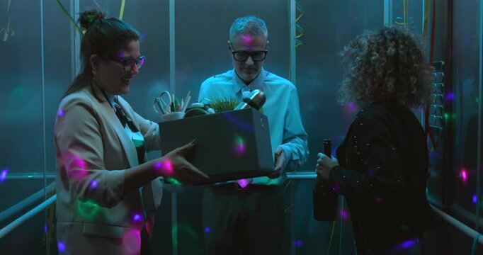 Employees celebrating in the elevator, they cheer up and engage their colleague who has just been fired and he joins the party